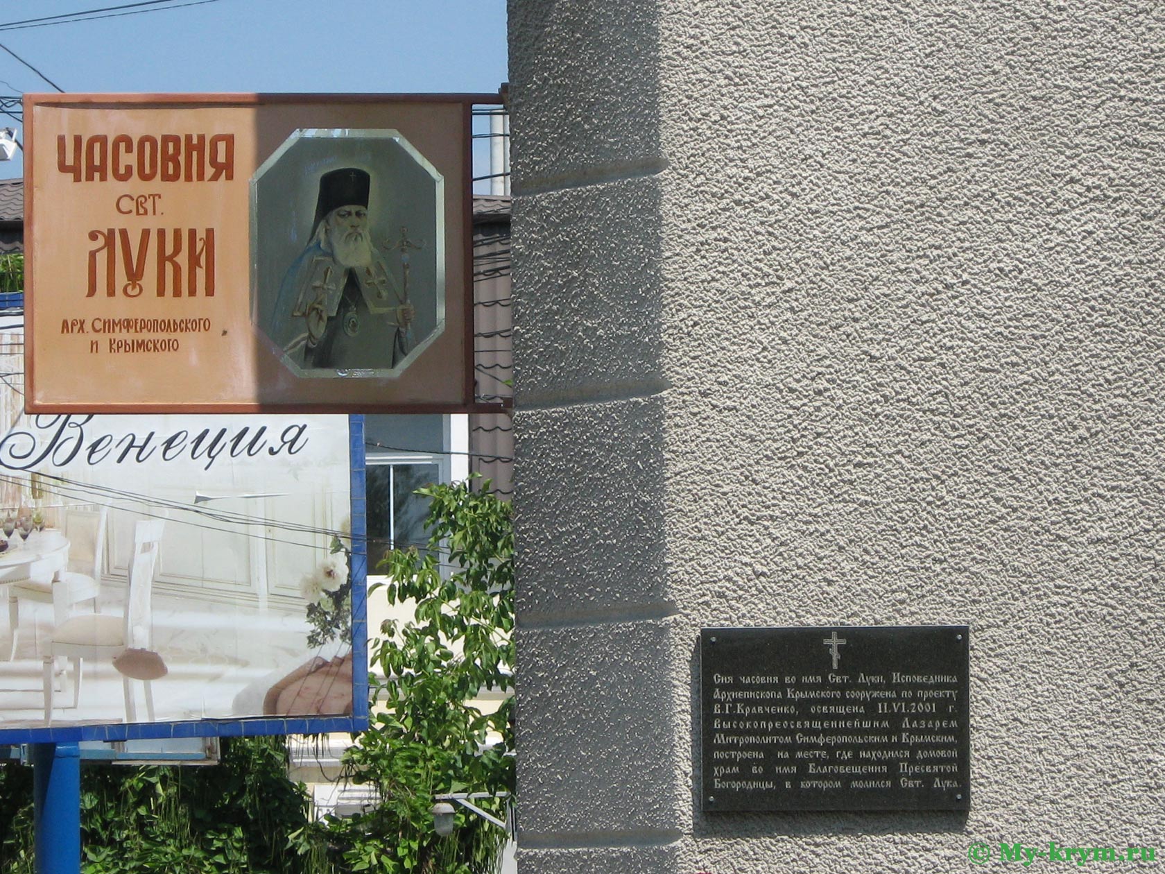Часовню Святого Луки в Симферополе поставили на том месте, где когда-то находился домовой храм Благовещения Пресвятой Богородицы, в котором молился сам святой старец. Здание построено по проекту симферопольского архитектора Кравченко. К одной из стен часовни прикреплен щит с названием и изображением святого образа. По окончанию строительства в том же 2001 году освящал новый культовый объект митрополит Симферопольский и Крымский Лазарь.