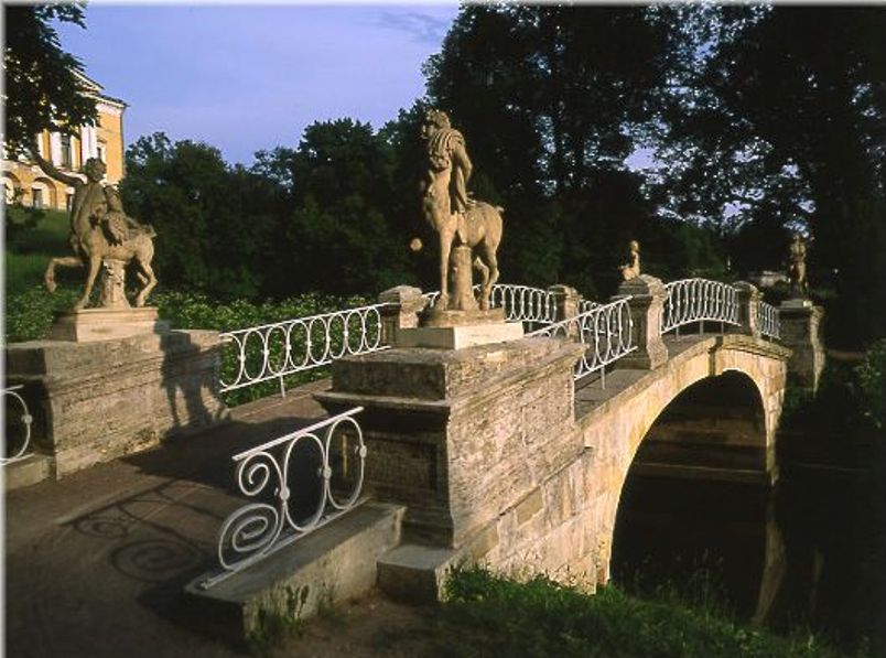 Мост Кентавров в Санкт-Петербурге переброшен для движения пешеходов через реку Славянку на территории Павловского парка вблизи Большого дворца.